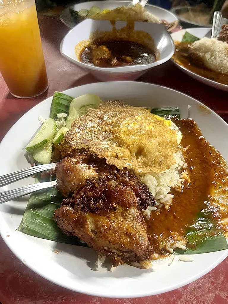 Placed on a banana leaf, the fragrance of the rice is enhanced while the dish is accompanied by its juicy fried chicken and sweet and spicy sambal.