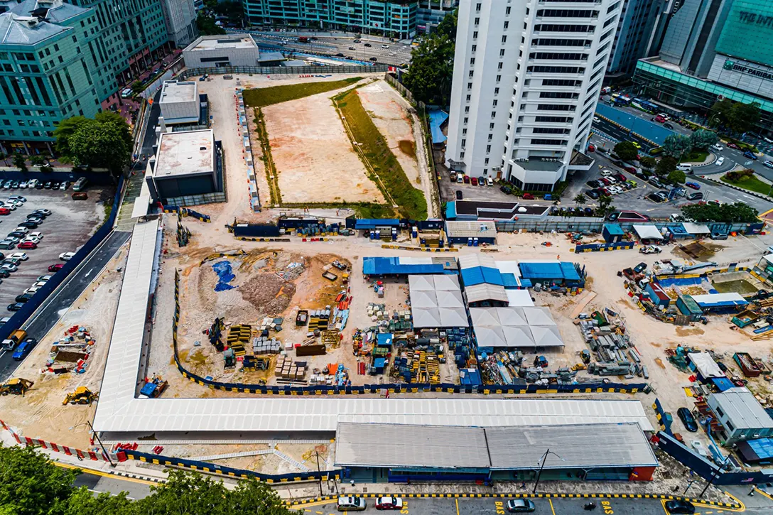 Aerial view of the ongoing construction progress at the Ampang Park MRT Station site.