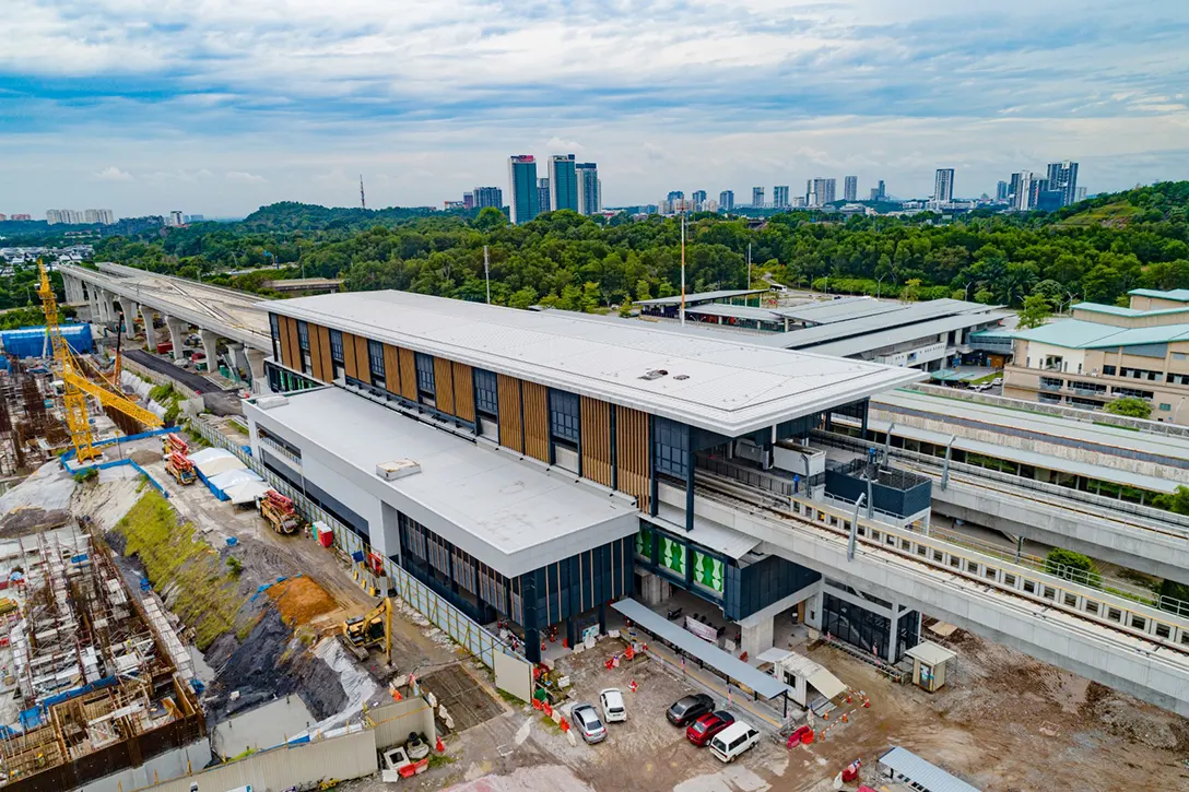 Aerial view of the Putrajaya Sentral MRT Station showing the aluminium capping panel works in progress.